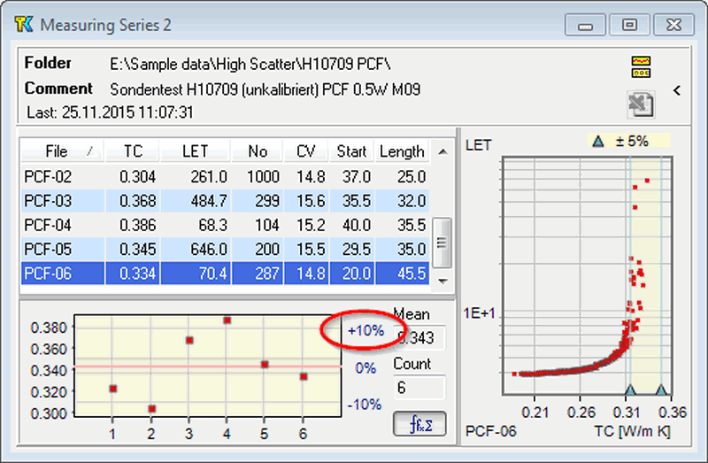 Das Messprogramm kann vollautomatisch Messreihen mit bis zu 99 Einzelmessungen durchführen, die gewünschte Anzahl wird vom Benutzer festgelegt. Die Ergebnisse werden laufend als Tabelle und Grafik am Bildschirm angezeigt, nach jeder Einzelmessung werden der Mittelwert und die prozentuale Abweichung sofort aktualisiert. So kann schon während der laufenden Messreihe die Streuung der Wärmeleitfähigkeitswerte überprüft werden. Liegt sie über ± 3%, ist das meist ein Hinweis auf instabile Umgebungstemperaturen. Dies kann durch Untersuchung der Daten mit dem im Softwarepaket enthaltenen Programm TkGraph überprüft werden.